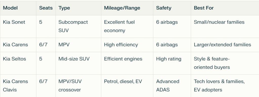 Finding the right Kia family cars Bangalore has to offer requires careful consideration of space, features, safety, and convenience. With several excellent Kia options available, it’s important to pick one that matches your family’s lifestyle. Let’s compare the most popular Kia family cars Bangalore families choose: Kia Sonet, Kia Carens, Kia Seltos, and the new Kia Carens Clavis.